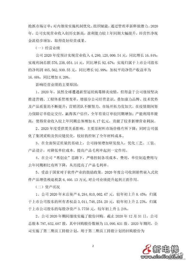 康力電梯:2020年營業(yè)收入42.8億元,同比增長16.84%;凈利潤4.86億元,同比增長92.99%。