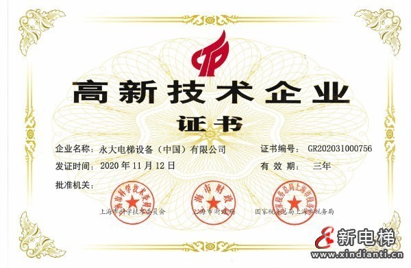 近日,永大電梯再度榮獲由科技部、財(cái)政部、稅務(wù)總局組成全國高新技術(shù)企業(yè)認(rèn)定管理工作領(lǐng)導(dǎo)小組主持頒發(fā)的國家高新技術(shù)企業(yè)證書。標(biāo)志著永大在技術(shù)創(chuàng)新、產(chǎn)學(xué)研用一體化、擁有的核心自主知識(shí)產(chǎn)權(quán)方面得到了國家的高度認(rèn)可;企業(yè)科技實(shí)力、創(chuàng)新能力處于行業(yè)前沿。