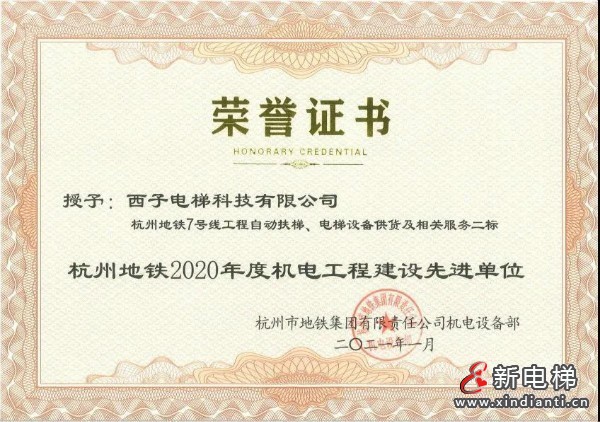 近日,杭州地鐵集團(tuán)就杭州地鐵7號(hào)線工程項(xiàng)目為西子電梯科技頒發(fā)了榮譽(yù)證書(shū),授予“杭州地鐵2020年度機(jī)電工程建設(shè)先進(jìn)單位”,其中西子電梯科技兩位項(xiàng)目經(jīng)理在杭州地鐵7號(hào)線工程項(xiàng)目中表現(xiàn)突出,被評(píng)為先進(jìn)個(gè)人,以此表彰。