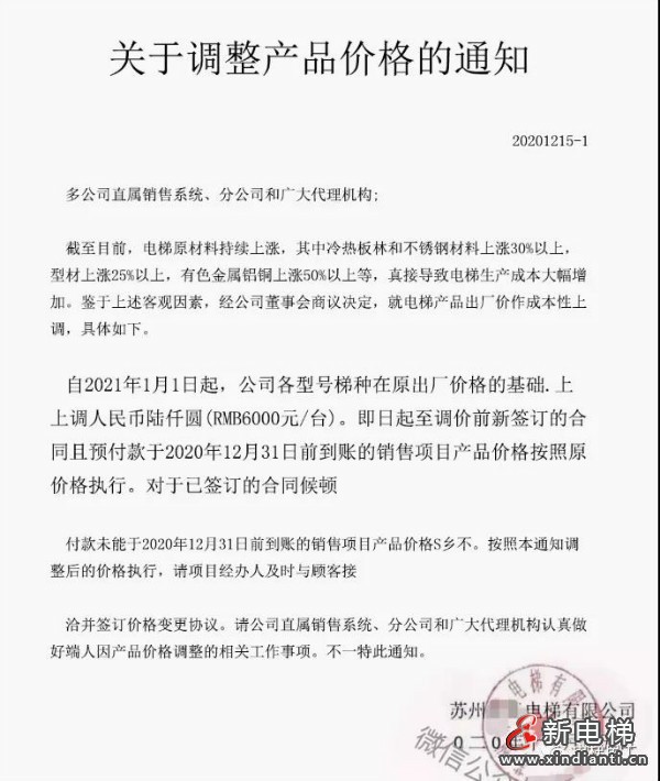 2020年12月15日蘇州某電梯廠家打響了電梯漲價(jià)的第一槍,由于電梯原材料的持續(xù)上漲,這家電梯廠各種型號(hào)的電梯均每臺(tái)上調(diào)6000元。這個(gè)漲幅可謂巨大??照{(diào),電動(dòng)車等行業(yè)已經(jīng)在調(diào)價(jià)。2021年3月3日某電梯廠家下發(fā)了漲價(jià)通知,3月14日起他們廠的所有電梯一臺(tái)上漲6000元。