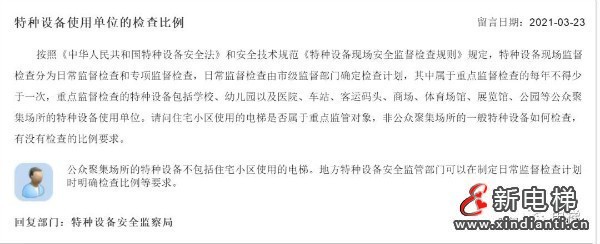 總局回復(fù):公眾聚集場(chǎng)所的特種設(shè)備不包括住宅小區(qū)使用的電梯。地方特種設(shè)備安全監(jiān)管部門(mén)可以在制定日常監(jiān)督檢查計(jì)劃時(shí)明確檢查比例等要求。