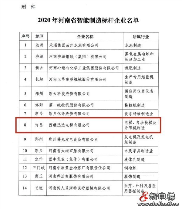 日前,西繼迅達電梯被河南省工業(yè)和信息化廳認定為河南省智能制造標桿企業(yè)。河南省智能制造標桿企業(yè)遴選工作于2020年3月份開始,2月1日,河南省工信廳下發(fā)豫工信產(chǎn)融【2021】9號文件《關(guān)于印發(fā)2020年河南省智能制造標桿企業(yè)名單的通知》,最終確定西繼迅達電梯等14家企業(yè)為2020年河南省智能制造標桿企業(yè),印證了公司在智能制造與生產(chǎn)方面的雄厚實力,已經(jīng)得到社會各界的充分認可。