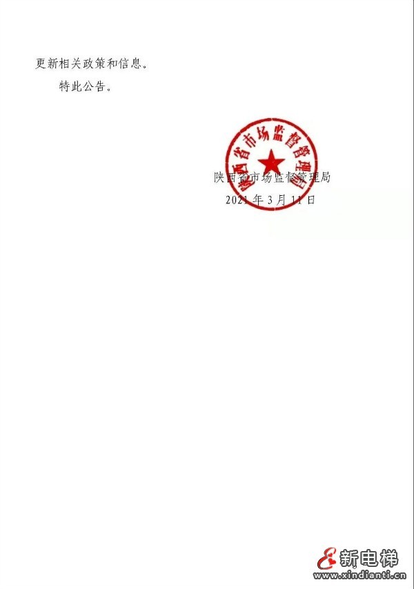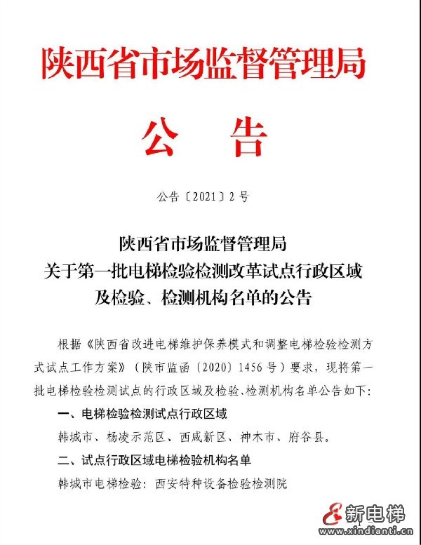 日前,陜西省市場(chǎng)監(jiān)督管理局發(fā)布《關(guān)于第一批電梯檢驗(yàn)檢測(cè)改革試點(diǎn)行政區(qū)域及檢驗(yàn)、檢測(cè)機(jī)構(gòu)名單的公告》(以下簡(jiǎn)稱《公告》),確定韓城市、楊凌示范區(qū)、西咸新區(qū)、神木市和府谷縣5個(gè)地區(qū)為電梯檢驗(yàn)檢測(cè)試點(diǎn)行政區(qū)域,同時(shí)還公布了12個(gè)電梯檢測(cè)機(jī)構(gòu)名單。