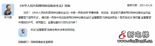 【網(wǎng)友提問】《中華人民共和國特種設(shè)備安全法》中第一百條說明“軍事裝備、核設(shè)施、航空航天器使用的特種設(shè)備安全的監(jiān)督管理不適用本法”。請問第一百條中核設(shè)施使用的特種設(shè)備安全的“監(jiān)督管理”內(nèi)容包括那些?是否指該法“第四章 監(jiān)督管理”中提到的許可、使用登記、監(jiān)督檢查和行政執(zhí)法內(nèi)容?