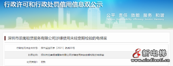 據(jù)深圳市市場監(jiān)督管理局網(wǎng)站消息,深圳市市場監(jiān)督管理局寶安局對深圳市泊寓租賃服務(wù)有限公司涉嫌使用未經(jīng)定期檢驗的電梯案作出行政處罰決定,罰款60000元。深圳市市場監(jiān)督管理局福田局對廣州奧的斯電梯有限公司深圳分公司涉嫌未按規(guī)定對福田小學(xué)電梯進行維保案作出行政處罰決定,罰款10000元。
