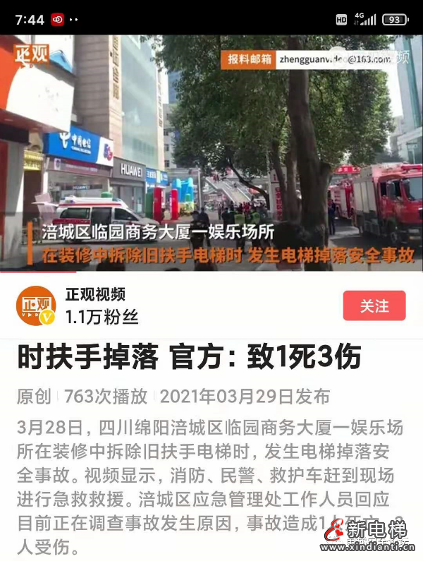 3月28日11時許,四川綿陽城區(qū)臨園商務(wù)大廈某娛樂場所在裝修過程中突發(fā)意外。裝修人員在拆除舊扶手電梯時,電梯突然掉落 ,多人躲避不及受傷 ,事故發(fā)生時致4人受傷,送醫(yī)后其中1人因搶救無效身亡,其他3人生命體征平穩(wěn)。