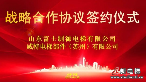 2021年4月25日,山東富士制御電梯有限公司與威特電梯部件(蘇州)有限公司在富士制御工廠舉行了隆重的簽約儀式,就雙方長期合作簽訂了《戰(zhàn)略合作協(xié)議書》,寧津縣人民政府副縣長王新志出席本次簽約儀式。