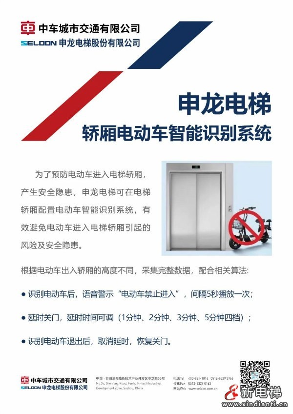 近日,申龍電梯推出電動車智能識別系統(tǒng),當(dāng)有電動車進(jìn)入電梯轎廂,該系統(tǒng)可自動識別,并采取“電動車禁止進(jìn)入”語音警示、延時(shí)關(guān)門等措施,有效預(yù)防電動車進(jìn)入電梯轎廂,產(chǎn)生安全隱患。