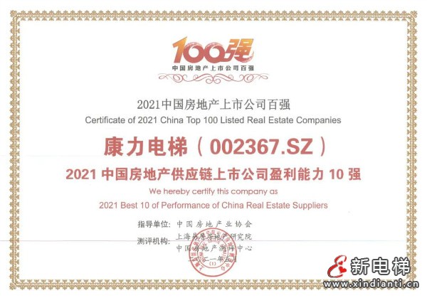 引領行業(yè)高質量發(fā)展 | 康力電梯榮獲“2021中國房地產(chǎn)供應鏈上市公司盈利能力10強”