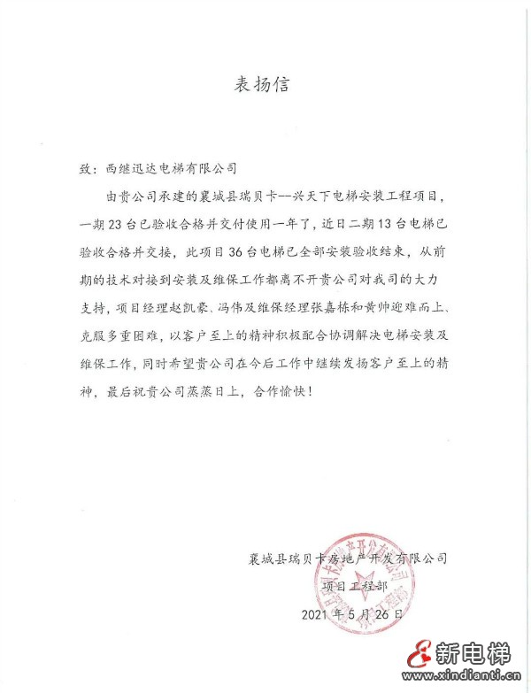 近日,西繼迅達(dá)收到了一封來自襄城縣瑞貝卡興天下項(xiàng)目的表揚(yáng)信,項(xiàng)目工程部在信中表達(dá)了對公司項(xiàng)目負(fù)責(zé)人員的充分肯定,并對項(xiàng)目對接到安裝維保工作給予了高度贊揚(yáng),希望公司能夠繼續(xù)發(fā)揚(yáng)客戶至上精神,圓滿完成項(xiàng)目后續(xù)工作!