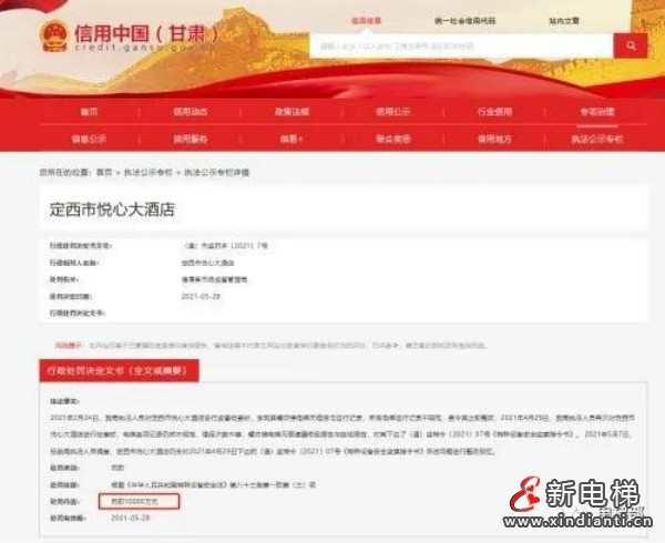 近日,定西市通渭縣市場監(jiān)督管理局一則一個(gè)億的“天價(jià)罰單”引發(fā)關(guān)注,定西二三里查詢信用中國(甘肅)了解到,5月28日,通渭縣市場監(jiān)督管理局發(fā)布(通)市監(jiān)罰字[2021)) 號行政處罰決定書,對定西市悅心大酒店電梯運(yùn)行記錄不規(guī)范屢查不改處罰1億元。定西二三里查詢《中華人民共和國特種設(shè)備安全法》第八十三條發(fā)現(xiàn),違背該條規(guī)定的處罰金額應(yīng)在一萬元以上十萬元以下。通渭縣市場監(jiān)督管理局向定西二三里回應(yīng)稱,該處罰的金額并不是1個(gè)億,而是1萬元,目前該酒店已經(jīng)對處罰金額如數(shù)繳納,“1個(gè)億的處罰金額是上傳網(wǎng)站時(shí)的手誤,并不是實(shí)際金額,目前我們正在聯(lián)系工作人員進(jìn)行修改。”