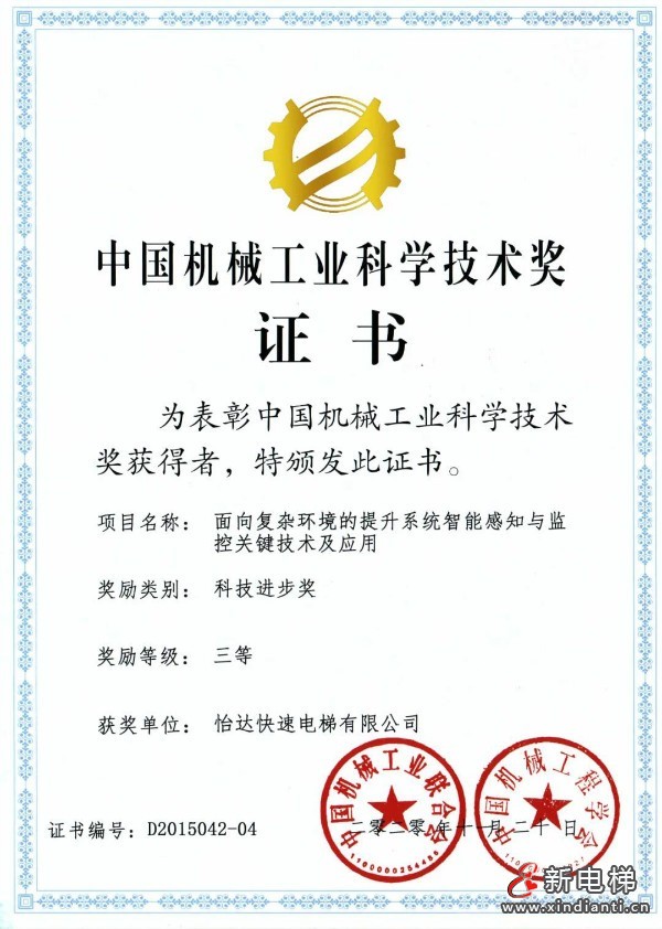 近日,由中國機械工業(yè)聯(lián)合會和中國機械工程學(xué)會共同設(shè)立的“中國機械工業(yè)科學(xué)技術(shù)獎”2020年度獎項揭曉,怡達(dá)快速電梯憑借《面向復(fù)雜環(huán)境的提升系統(tǒng)智能感知與監(jiān)控關(guān)鍵技術(shù)及應(yīng)用》項目獲得科技進(jìn)步三等獎。