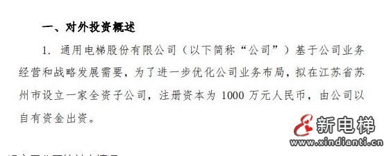 通用電梯以自有資金1000萬在江蘇省蘇州市設立一家全資子公司