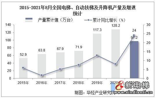 2021年1-8月全國電梯、自動扶梯及升降機累計產(chǎn)量為97.2萬臺,比上年同期增加了20.6萬臺,產(chǎn)量累計同比增長24%;月均產(chǎn)量為12.2萬臺。
