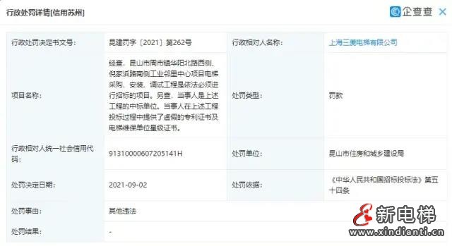 昆山市周市鎮(zhèn)工業(yè)鄰里中心項目工程招標(biāo)。上海三菱電梯有限公司是工程中標(biāo)單位。上海三菱電梯有限公司在上述工程投標(biāo)過程中提供了虛假的專利證書及電梯維保單位星級證書。9月2日,昆山市住房和城鄉(xiāng)建設(shè)局對上海三菱電梯有限公司作出行政處罰,罰款3.7696萬元。