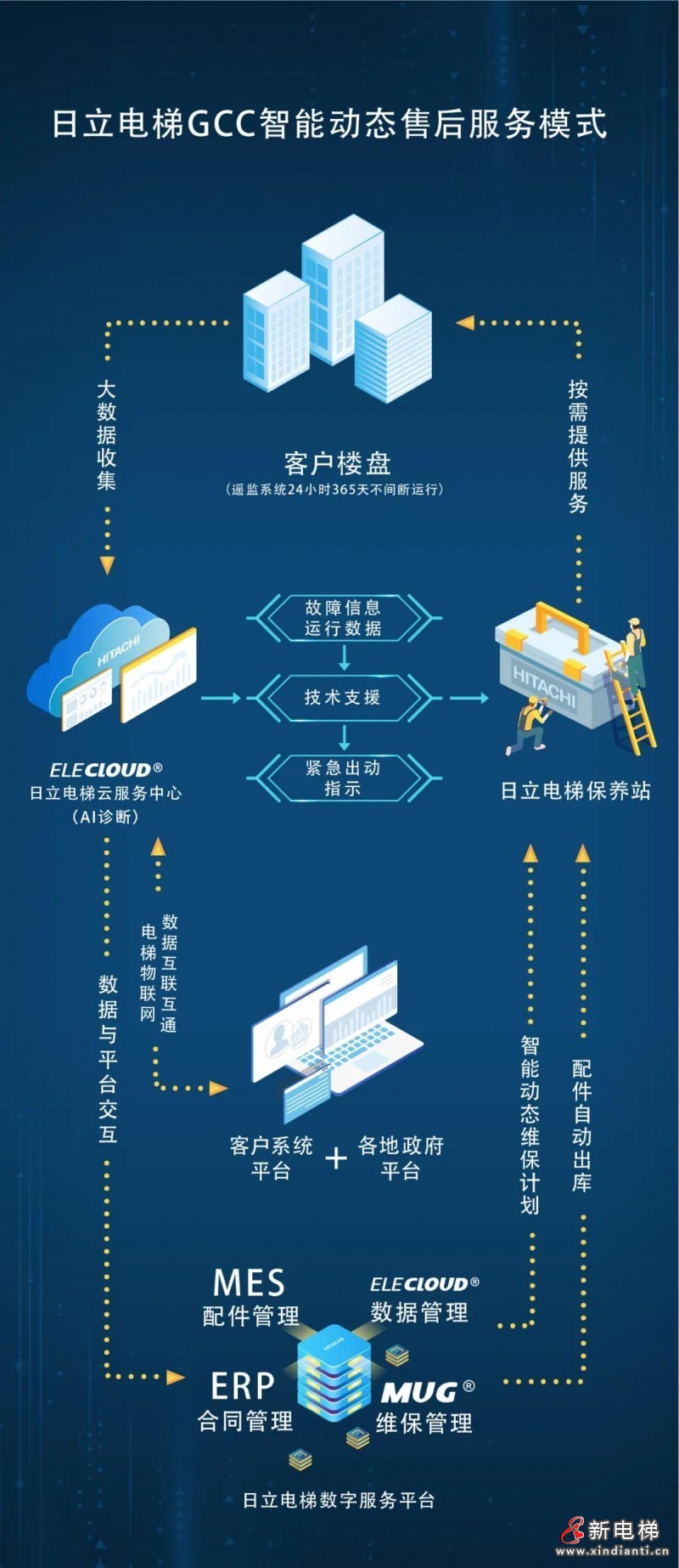 日立電梯以三級遙監(jiān)中心為核心,對海量的電梯數(shù)據(jù)實(shí)時進(jìn)行收集和處理,最終實(shí)現(xiàn)“客戶電梯預(yù)診斷、24小時智慧監(jiān)控中心、自動派工計(jì)劃、配件智能倉儲、政企維保質(zhì)量監(jiān)管”的全業(yè)務(wù)管理。
