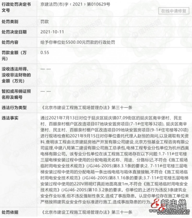 杭州西奧電梯有限公司因位于北京延慶區(qū)延慶鎮(zhèn)項(xiàng)目電梯施工現(xiàn)場(chǎng)問題,2021年10月11日被北京市住房和城鄉(xiāng)建設(shè)委員會(huì)給與了5500元的罰款的行政處罰。