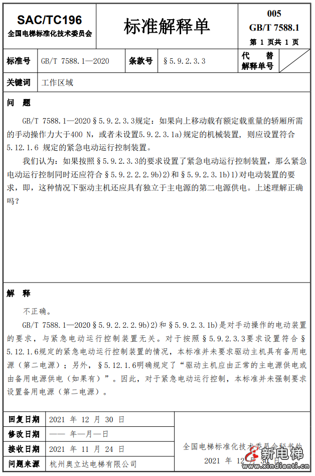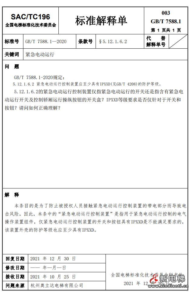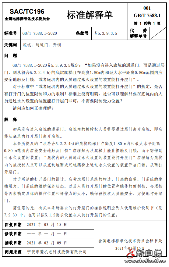 關(guān)于發(fā)布GB/T 7588.1—2020《電梯制造與安裝安全規(guī)范  第1部分:乘客電梯和載貨電梯》第3至5號(hào)解釋單的通知