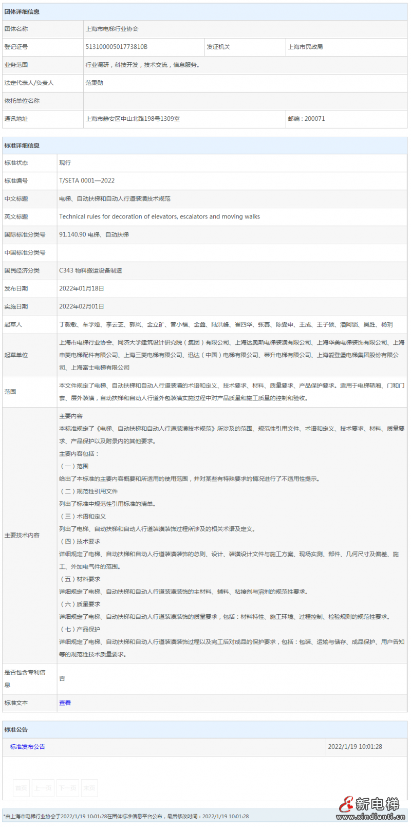 關于發(fā)布《電梯、自動扶梯和自動人行道裝潢技術規(guī)范》團體標準的公告