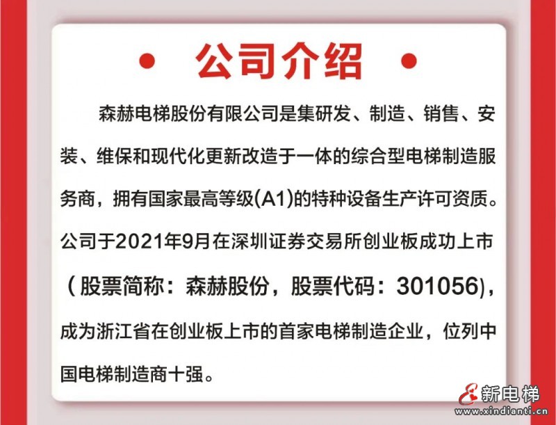 森赫電梯股份有限公司是集研發(fā)、制造、銷售、安裝、維保和現(xiàn)代化更新改造于一體的綜合型電梯制造服務商,擁有國家最高等級(A1)的特種設備生產(chǎn)許可資質。公司于2021年9月在深圳證券交易所創(chuàng)業(yè)板成功上市(股票簡稱:森赫股份,股票代碼:301056)成為浙江省在創(chuàng)業(yè)板上市的首家電梯制造企業(yè),位列中國電梯制造商十強。