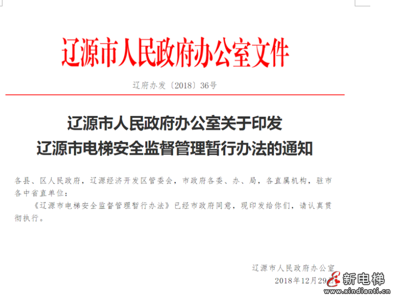 遼源市人民政府辦公室關(guān)于印發(fā)遼源市電梯安全監(jiān)督管理暫行辦法的通知(遼府辦發(fā)〔2018〕36號)