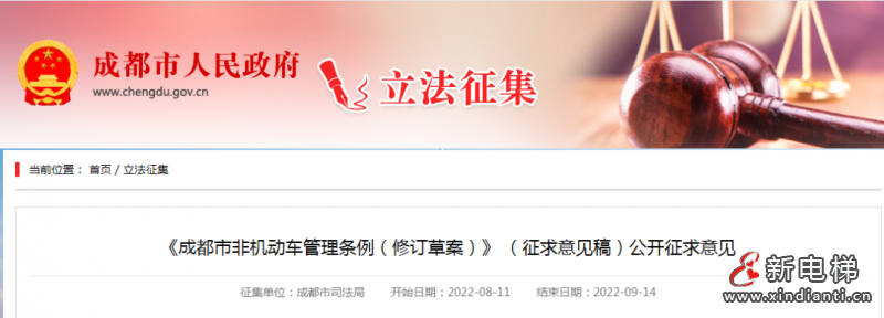 電梯轎廂運(yùn)載電動(dòng)自行車單位五千元以上五萬(wàn)元以下罰款,個(gè)人警告或五百元以下罰款,成都公開(kāi)征求意見(jiàn)