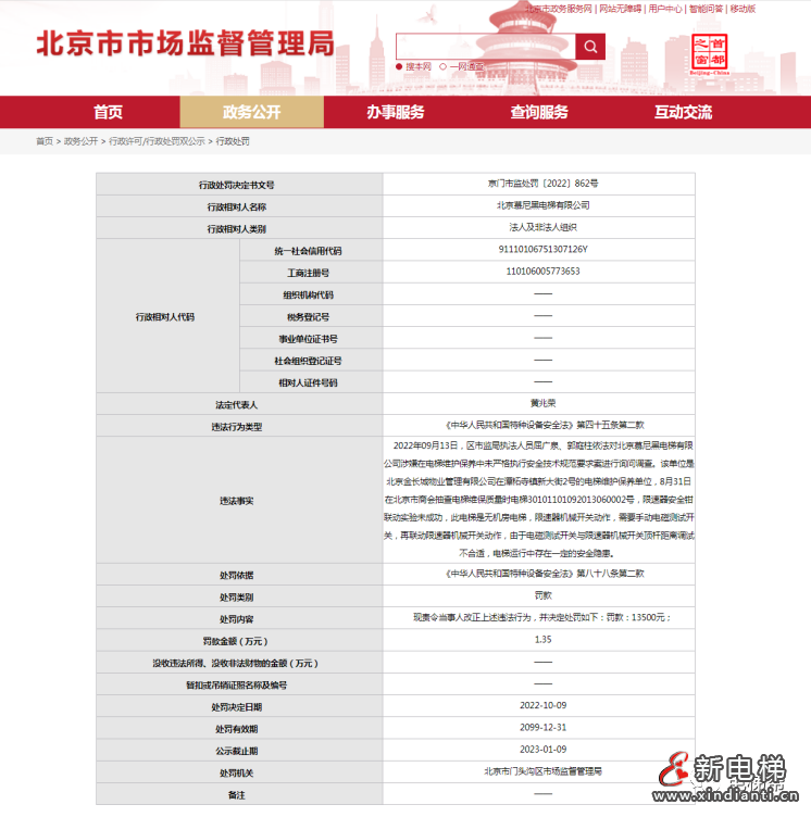 近日,北京市門頭溝區(qū)市場監(jiān)督管理局發(fā)布行政處罰決定書(京門市監(jiān)處罰〔2022〕862號),涉及北京慕尼黑電梯有限公司。