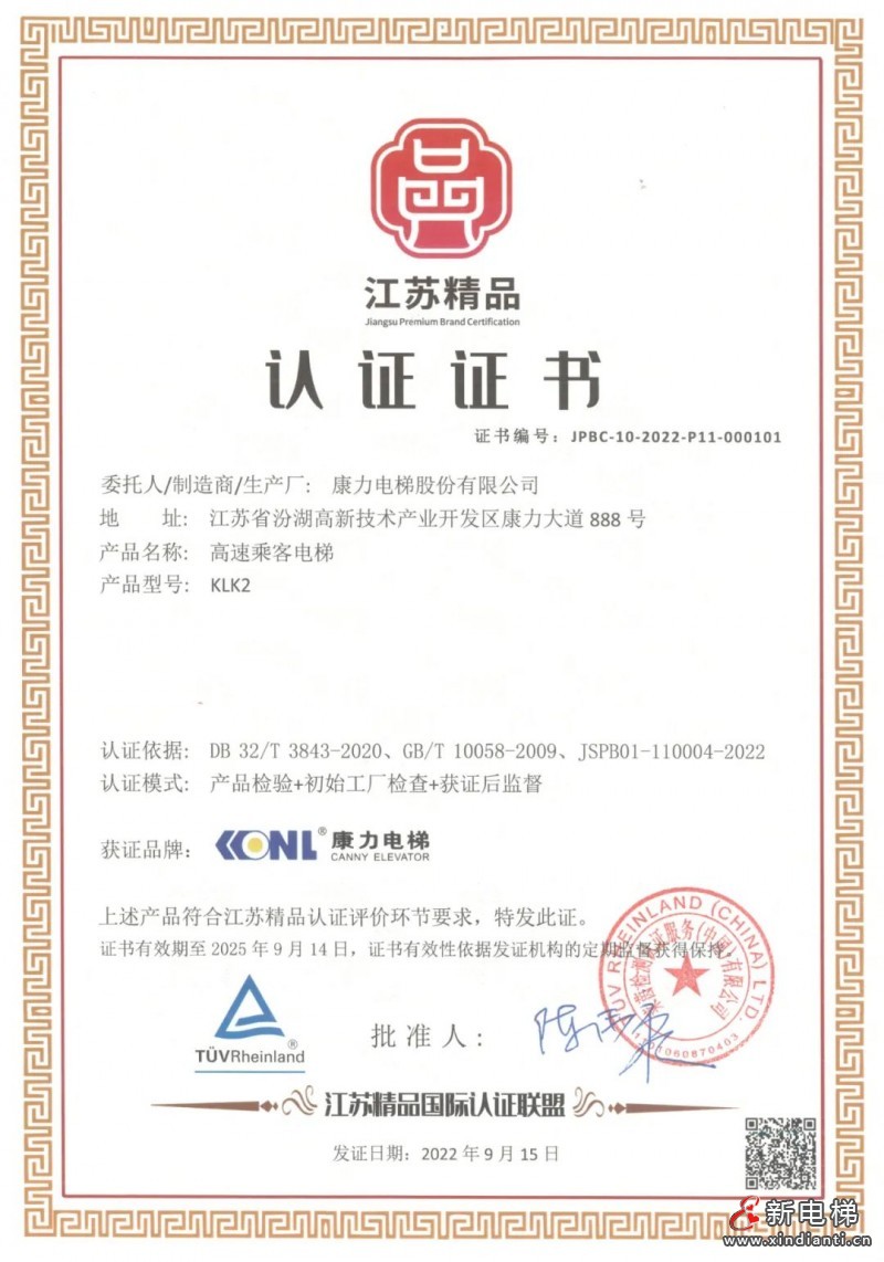 又一王牌產(chǎn)品迎殊榮 | 康力高速電梯獲“江蘇精品”認證