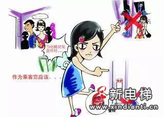 幫助他人,文明乘梯。幫助趕乘電梯的人按開門按鈕;幫助手提物品的人按樓層按鈕;幫助殘疾人操作電梯。