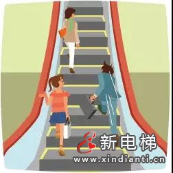 乘坐扶梯時應該站在梯級上扶好扶手,耐心等待。不要在扶梯上奔跑。