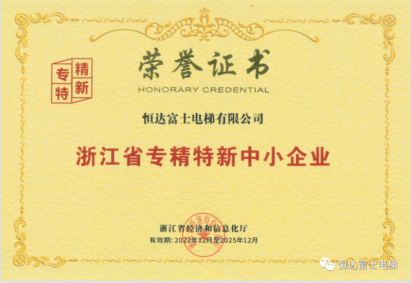 近日,浙江省經(jīng)濟和信息化廳公示了“關(guān)于2022年度浙江省專精特新企業(yè)名單”,恒達富士電梯憑借技術(shù)創(chuàng)新實力和市場影響力成功入選,獲評認定為浙江省專精特新企業(yè)。