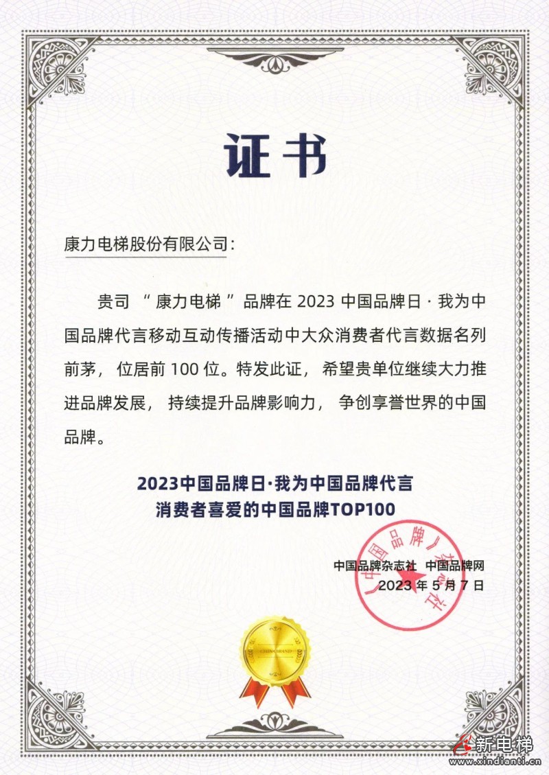 中國品牌·實力典范 | 康力電梯首批入選中國品牌·典范100