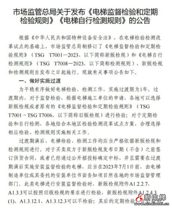 鄭州市市場監(jiān)管總局6月26日關于發(fā)布《電梯監(jiān)督檢驗和定期檢驗規(guī)則》《電梯自行檢測規(guī)則》(2023年第14號)的公告,請按要求認真執(zhí)行。