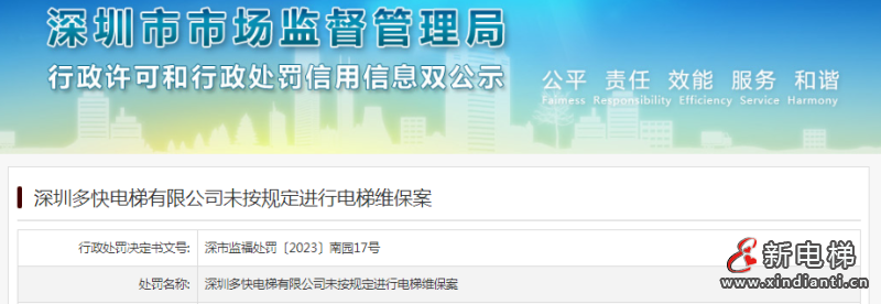 深圳多快電梯有限公司未按規(guī)定進行電梯維保被罰款10000元