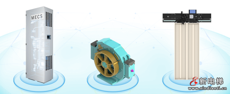 從左到右分別為:智能化MECS控制柜、永磁同步無齒輪曳引機、智能門機系統(tǒng)