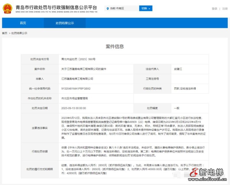 近日,青島市市北區(qū)市場監(jiān)督管理局公示了關于江蘇建奧電梯工程有限公司的案件。處罰決定書文號為“青北市監(jiān)處罰〔2023〕560號”。