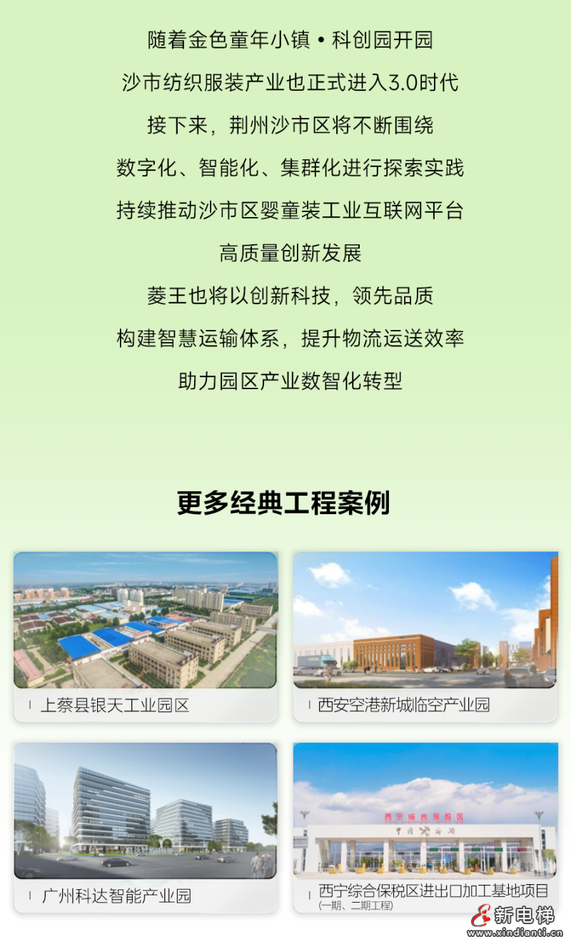 隨著金色童年小鎮(zhèn)·科創(chuàng)園開(kāi)園,沙市紡織服裝產(chǎn)業(yè)也正式進(jìn)入3.0時(shí)代。接下來(lái),荊州沙市區(qū)將不斷圍繞數(shù)字化、智能化、集群化進(jìn)行探索實(shí)踐,持續(xù)推動(dòng)沙市區(qū)嬰童裝工業(yè)互聯(lián)網(wǎng)平臺(tái),高質(zhì)量創(chuàng)新發(fā)展,菱王也將以創(chuàng)新科技,領(lǐng)先品質(zhì)構(gòu)建智慧運(yùn)輸體系,提升物流運(yùn)送效率助力園區(qū)產(chǎn)業(yè)數(shù)智化轉(zhuǎn)型。