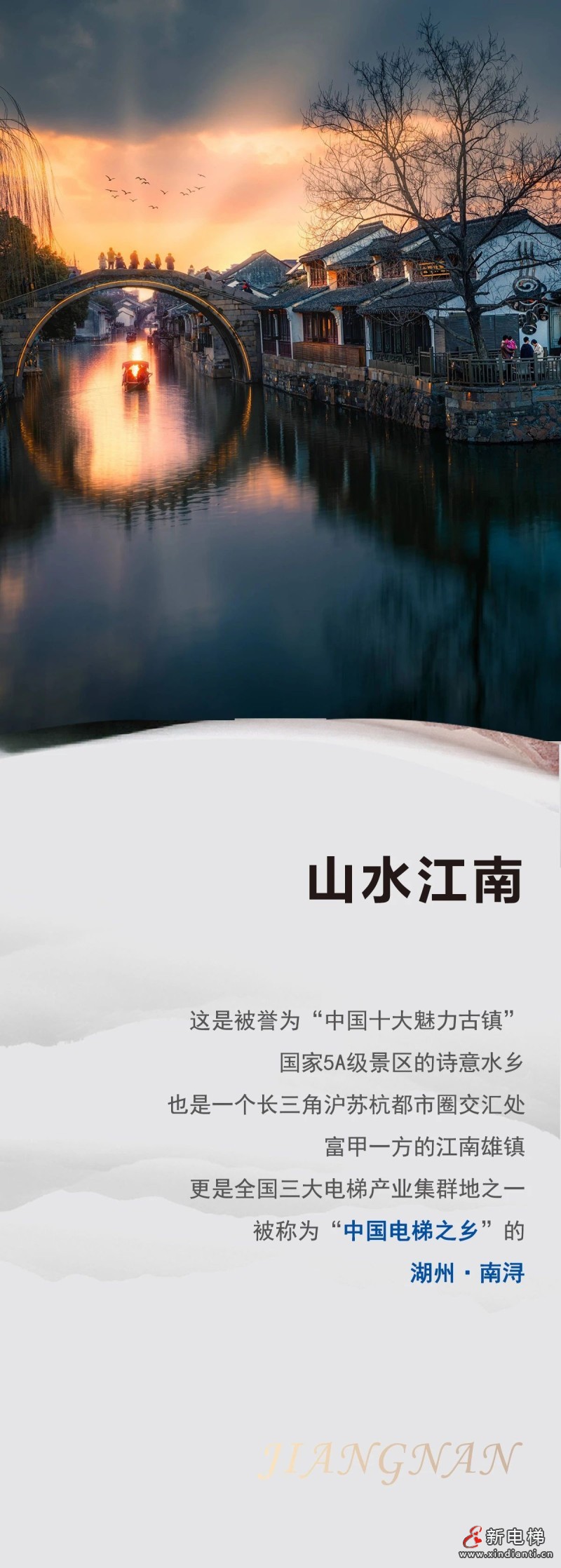 山水江南,這是被譽(yù)為“中國(guó)十大魅力古鎮(zhèn)”,國(guó)家5A級(jí)景區(qū)的詩(shī)意水鄉(xiāng),也是一個(gè)長(zhǎng)三角滬蘇杭都市圈交匯處,富甲一方的江南雄鎮(zhèn)更是全國(guó)三大電梯產(chǎn)業(yè)集群地之一,被稱(chēng)為“中國(guó)電梯之鄉(xiāng)”的湖州·南潯。