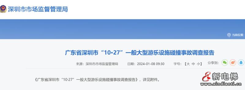 2024年1月8日報道,深圳市人民政府事故調查組公布調查報告,認定深圳歡樂谷“10·27”過山車碰撞事故是一起因企業(yè)安全主體責任落實不到位、事故設備維護不善等原因造成的一般特種設備責任事故。事故調查組對12名責任人員和相關責任單位提出了處理建議,其中3人建議移送司法機關處理。