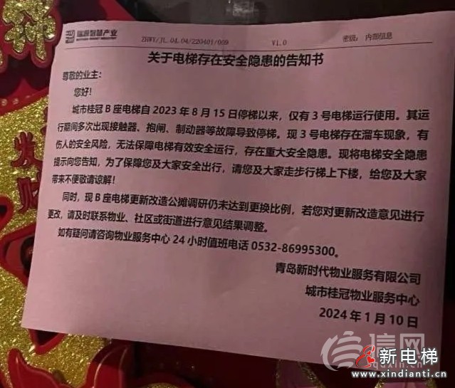 近日,位于青島市西海岸新區(qū)城市桂冠寫字樓的電梯從去年8月份就開始陸續(xù)停運,直至幾天前全部停擺,員工想去公司上班只能通過步梯。對此,青島新時代物業(yè)服務有限公司的相關工作人員表示,由于該樓座電梯運行時間過久出現(xiàn)風險問題,為了業(yè)主安全不得已只能停止運行。下一步,長江路街道辦將組織業(yè)主代表對電梯公司進行公開招標,協(xié)商更換事宜。但在此期間業(yè)主只能通過步梯上下班。