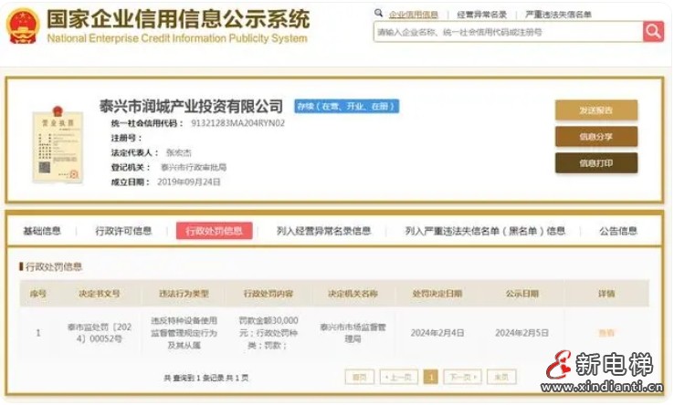 使用無(wú)檢驗(yàn)合格材料電梯 泰興市潤(rùn)城產(chǎn)業(yè)投資有限公司被罰3萬(wàn)元