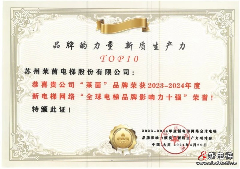 4月29日,在太原舉辦的“品牌的力量,新質(zhì)生產(chǎn)力,2023-2024年度新電梯網(wǎng)絡(luò)全球電梯品牌影響力頒獎盛典暨電梯新質(zhì)生產(chǎn)力研討會”上,萊茵電梯再次展現(xiàn)了其卓越實力。作為電梯行業(yè)知名企業(yè),萊茵電梯榮獲了多項重要榮譽(yù),讓我們一起看看吧!