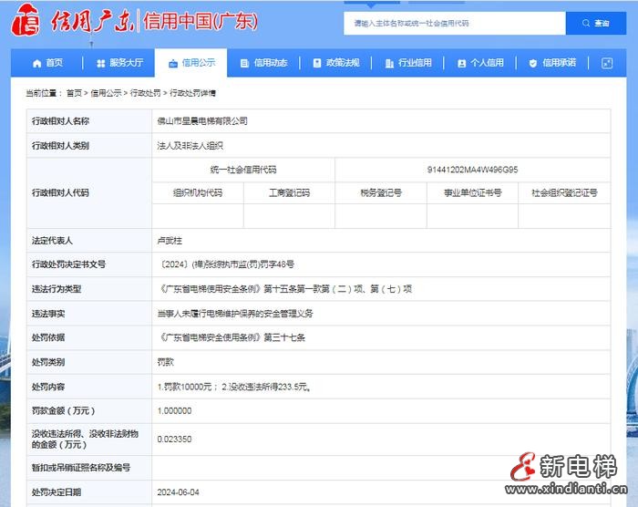 2024年6月4日消息,佛山市某晨電梯有限公司因未履行電梯維護(hù)保養(yǎng)的安全管理義務(wù),被佛山市禪城區(qū)張槎街道辦事處罰款10000元并沒收違法所得233.5元。