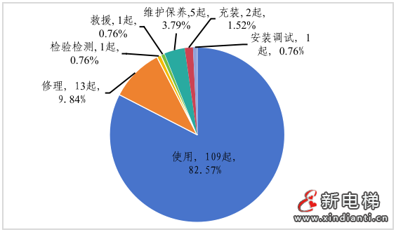按發(fā)生環(huán)節(jié)劃分,發(fā)生在使用環(huán)節(jié)109起,占82.57%;修理環(huán)節(jié)13起,占9.84%;維護(hù)保養(yǎng)環(huán)節(jié)5起,占3.79%;充裝環(huán)節(jié)2起,占1.52%;安裝調(diào)試環(huán)節(jié)1起,占0.76%;檢驗檢測環(huán)節(jié)1起,占0.76%;救援環(huán)節(jié)1起,占0.76%(見圖5)。