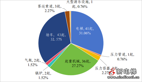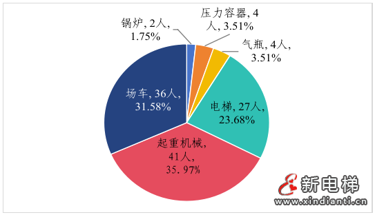 按設(shè)備類別劃分,鍋爐事故2起,死亡2人;壓力容器事故3起,死亡4人;氣瓶事故2起,死亡4人;電梯事故41起,死亡27人;起重機(jī)械事故36起,死亡41人;場車事故43起,死亡36人;壓力管道事故1起,客運(yùn)索道事故3起,大型游樂設(shè)施事故1起,均未造成人員死亡。(見圖3、圖4)其中,場車、電梯和起重機(jī)械事故占比較大,占事故總起數(shù)的90.90%、死亡總?cè)藬?shù)的91.23%。