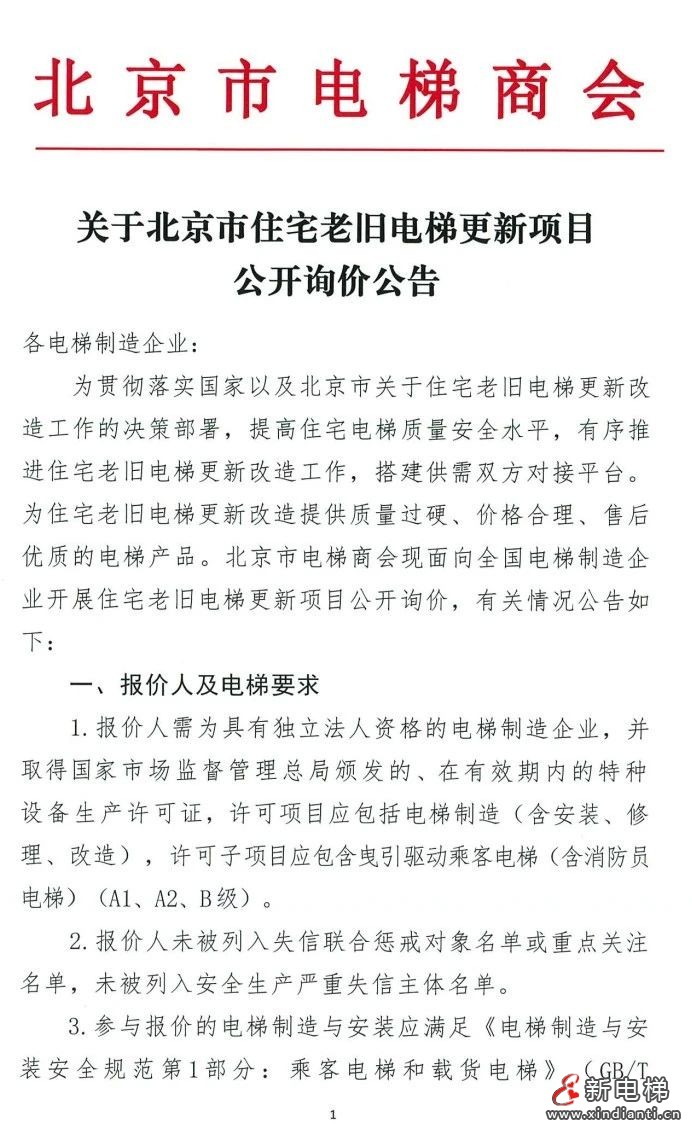 北京市電梯商會現(xiàn)面向全國電梯制造企業(yè)開展住宅老舊電梯更新項目公開詢價,有關(guān)情況公告如下:‌‌