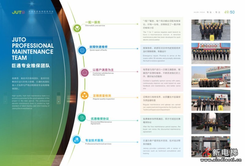 多年來,巨通機(jī)電本著“以專業(yè)的技術(shù)和不懈的努力為客戶提供百分百的滿意”的服務(wù)理念,堅(jiān)持不斷發(fā)展,目前維保服務(wù)電梯達(dá)6000臺以上,每年安裝電梯2000臺以上。