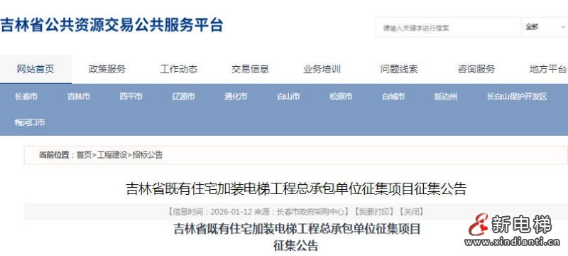 吉林省既有住宅加裝電梯工程總承包單位征集項目旨在通過公開征集方式,選擇5家工程總承包單位,為全省既有住宅加裝電梯項目提供“交鑰匙工程”服務(wù),有效期自成交通知書發(fā)出之日起五年。