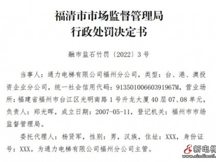 日前,福清市市場(chǎng)監(jiān)督管理局公布一則行政處罰決定書(shū)。通力電梯有限公司福州分公司(以下簡(jiǎn)稱(chēng):當(dāng)事人)因違反特種設(shè)備安全法被市場(chǎng)監(jiān)管部門(mén)處罰。[詳情]