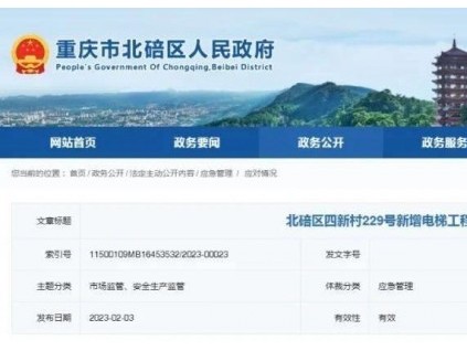 2022年9月15日上午11時左右,北碚區(qū)四新村229號新增電梯工程發(fā)生一起高墜事故,造成1人死亡,直接經(jīng)濟損失約72萬元。[詳情]